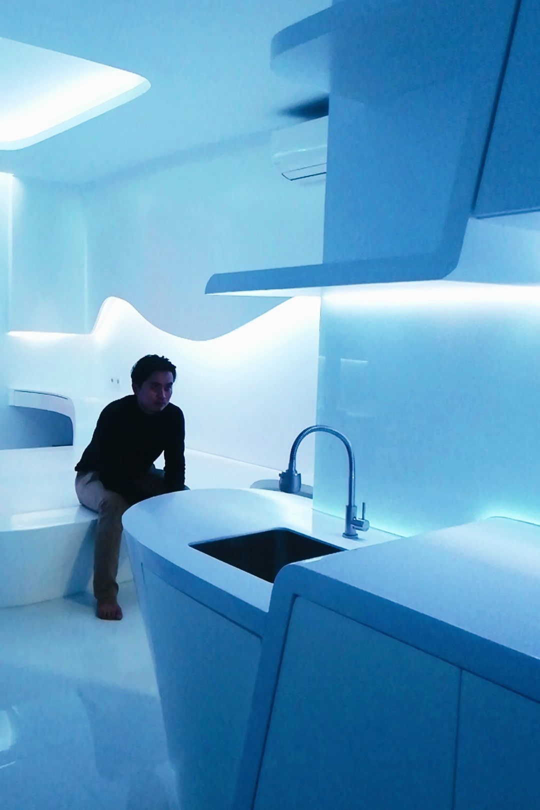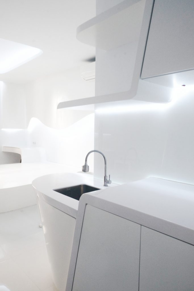 Parametric design approach. In Best Western Apartment, customization, design and material choice played a large role in the visual and spatial interior space. A fluid space makes a seamless experience, pushing the boundaries of spatial concepts. Curved walls create a particularly unsettling feeling but in a way that generates interest rather than headaches.
