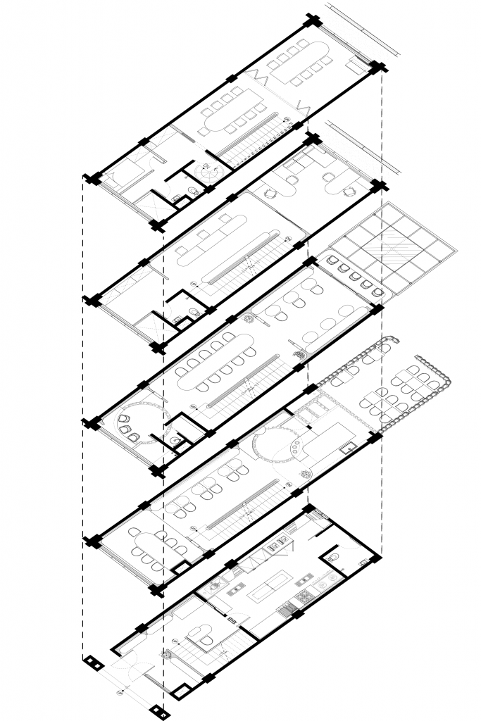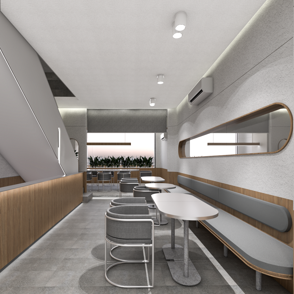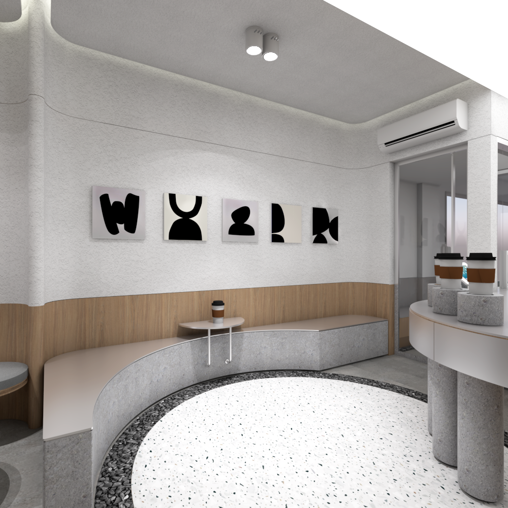 Tawa Riang is a mix-use commercial space, equipped with cafe and office area. The cafe is designed in a playful yet soft manner, with curved edges applied to the furniture, floor pattern, and openings. It also plays a lot with texture and patten, prevalent in the terrazzo floor and kamprot wall.