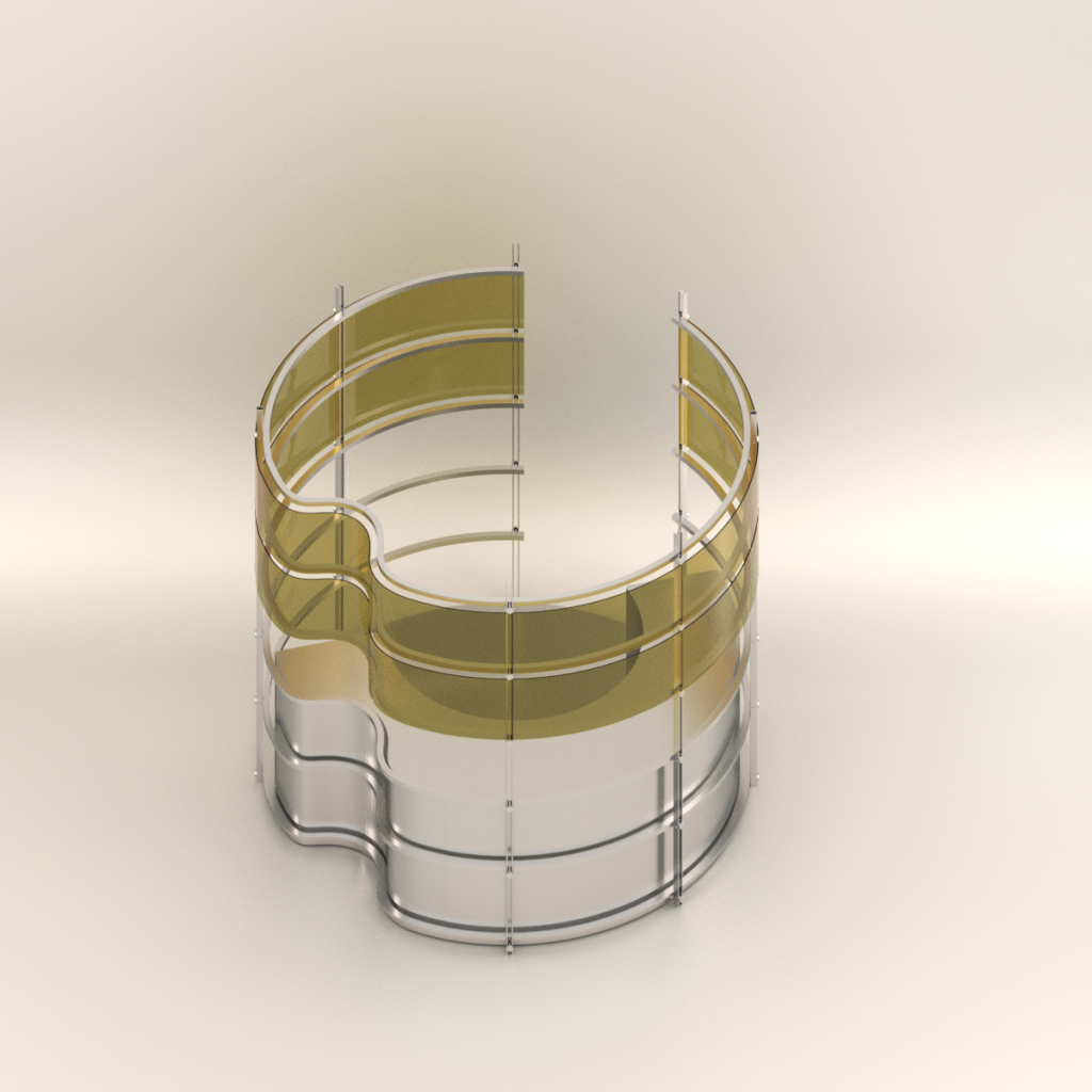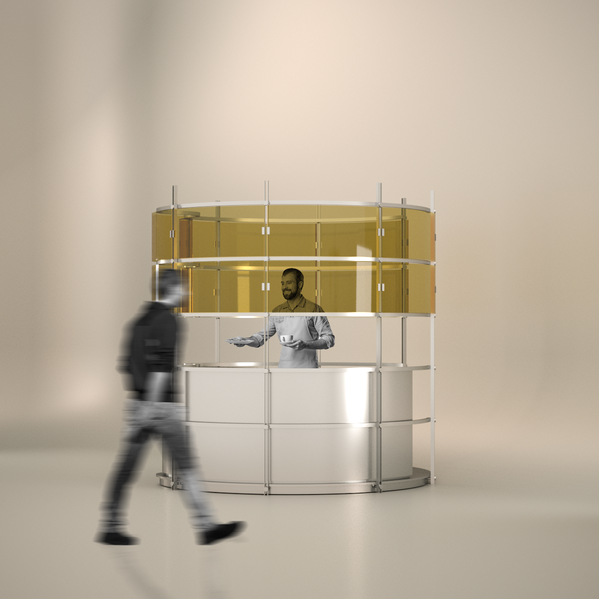 With a similar base design from the previous project, Bun&Lau develop another prototype for Yellow. Equipped with industrial aesthetic notable on the exposed steel material and visible joinery. Vertically, the design is divided with metal bars and curved acrylic panels.